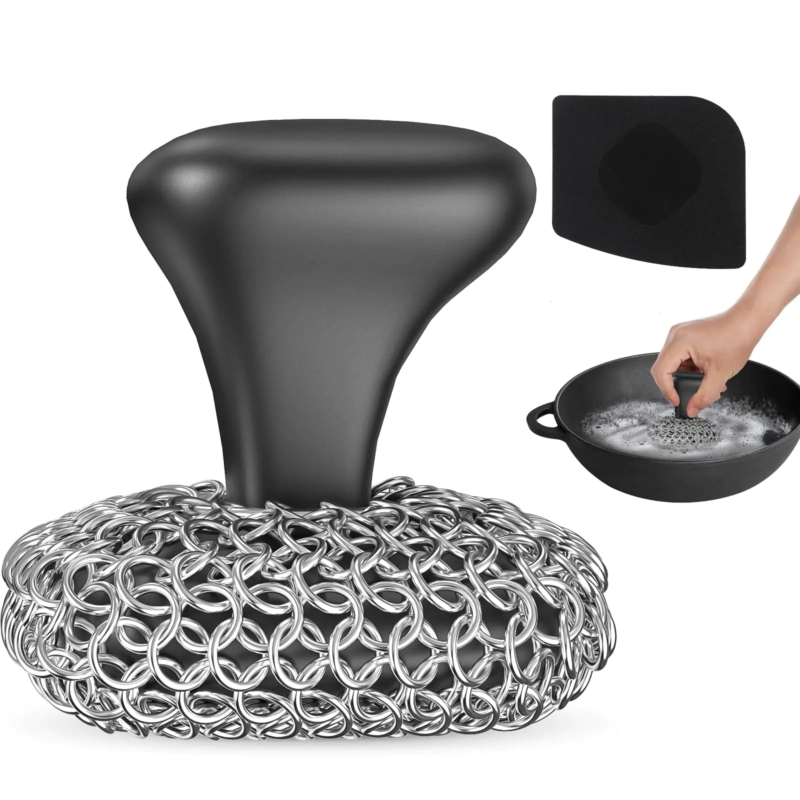 [【1 SCRUBBER + 1 SCRAPER】: Cast iron scrubber is made of 316 stainless steel + silicone. Silicone has extreme stability can resist high temperatures. Pan scraper is made of thickened ABS plastic non-stick and non-cracking heat-resistant up to 275 °F 【ERGONOMIC DESIGN】: Cast iron chainmail scrubber is designed with ergonomic handle. Contact area between the long handle and your hand is larger comfortable to grip. The handle can protecte your hands from contact with chains or cleaners 【THICKER & WIDER SILICONE】: Upgraded silicone base is thicker and wider providing a larger contact area to improve cleaning efficiency. Silicone has high toughness non-slip and heat resistance and will not deform or collapse after long-term use 【HAND-WOVEN 3D CHAIN STRUCTURE】: 3D chain structure is exquisite and meticulous. Steel mesh is integrally molded making our metal scrubbers even more solid and strong. The slimmer rings are more effective and quick to clean without the need for soap 【VERSATILE CLEANING TOOLS】: The pot scrubbers for kitchen and pan scraper tool can simply rinse under the tap or put in the dishwasher. Our cast iron skillet scrubber kit makes it easy and quick to deep clean pans pots skillets and even pizza stones]